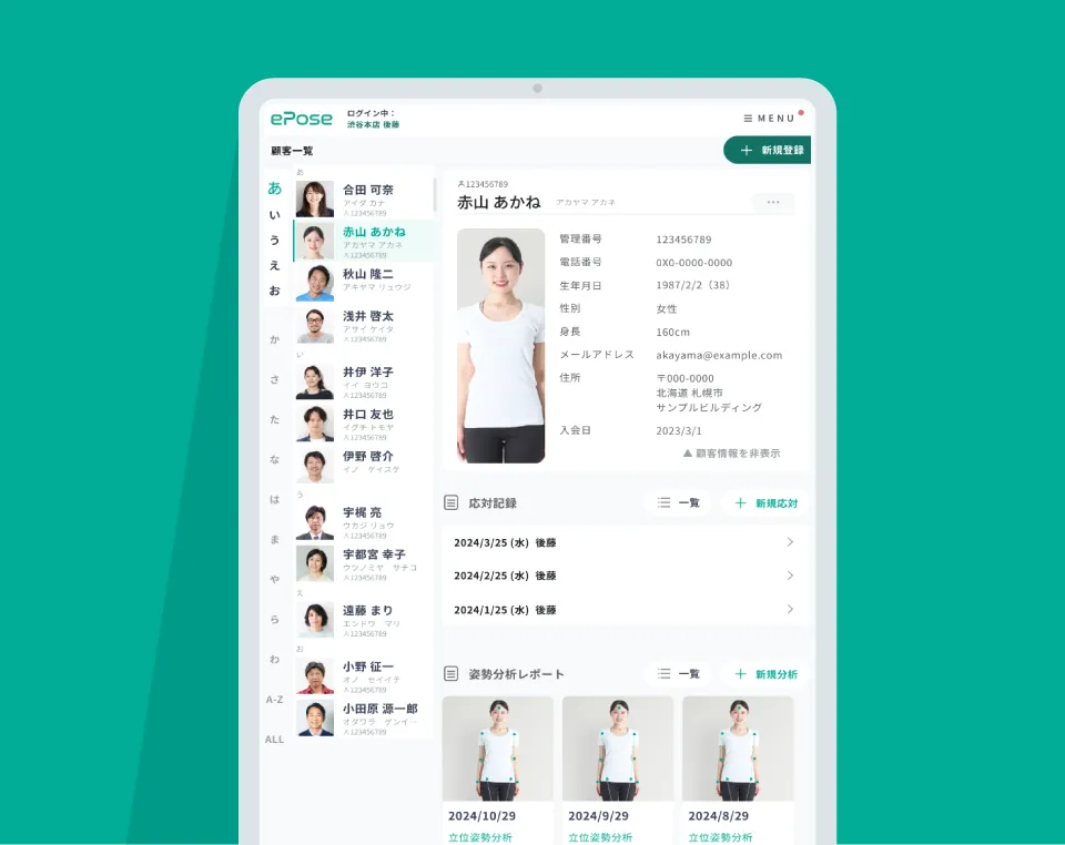 ePose(イーポーズ)は、AIによる姿勢分析と顧客管理をタブレット1台で実現できるwebアプリです。分析レポートは印刷やメールでお客様と共有できます。