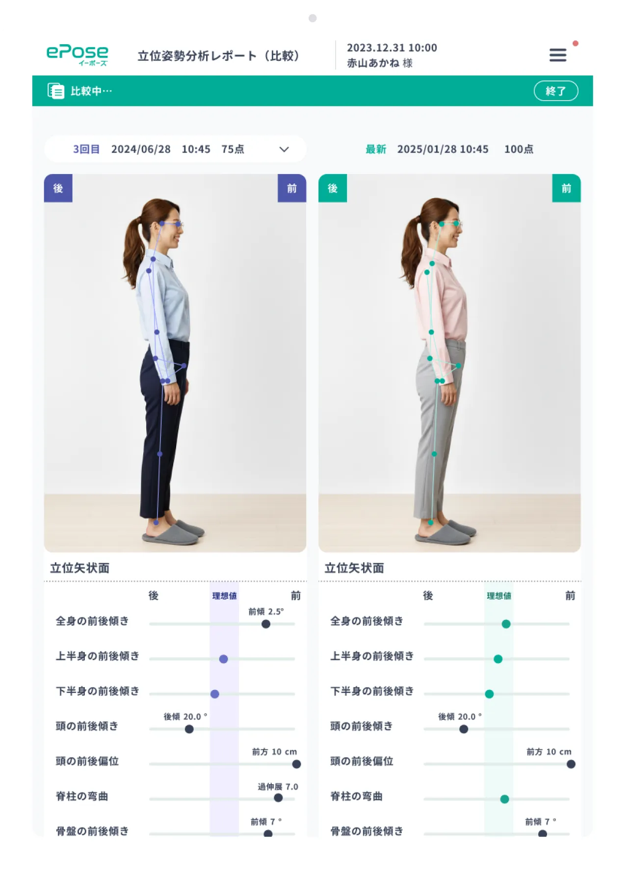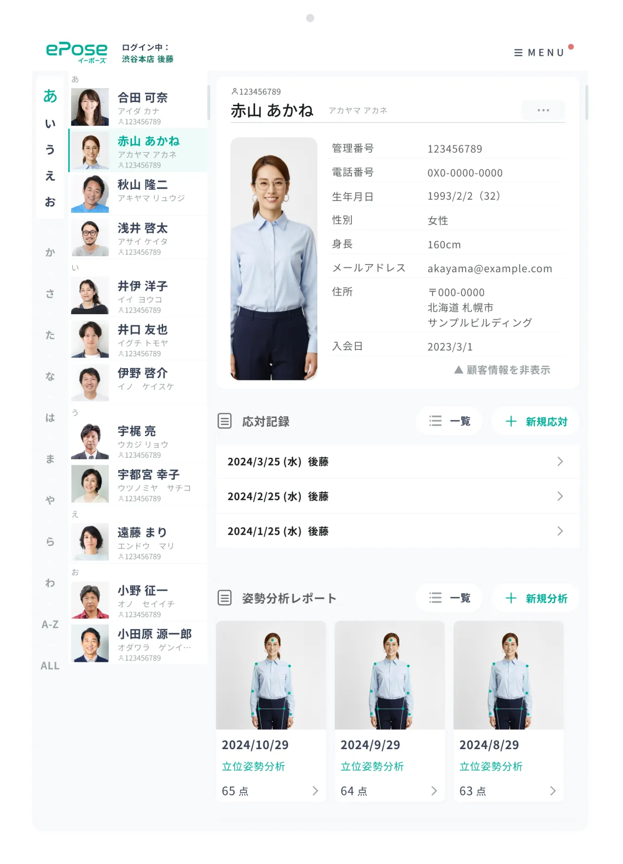 ePoseで姿勢分析をすると、お客様の写真が同時に手に入ります。カルテだけではなかなか難しい、スタッフ間での顧客様の情報共有にも役立つ機能です。