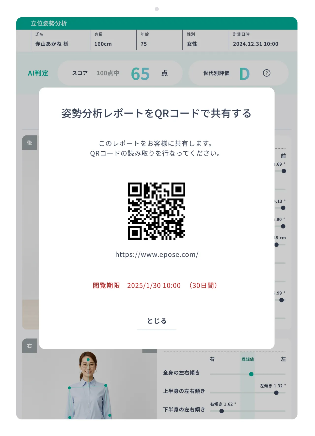 姿勢分析レポートを見て、スコアや姿勢タイプなどをお伝えします。レポートはQRコードを読み取ることで共有できますので、お客様へのプレゼントに。